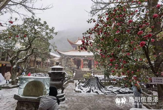 西山华亭寺内,盛放的山茶花姹紫嫣红,与皑皑白雪构成最美景致,一大早便吸引了游客及市民纷纷前来赏雪。但是受冰雪天气影响,西山风景区大面积道路冰凌,目前景区暂停对外开放,环保大巴暂停发车,建议登山市民暂不入山。