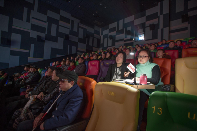△杜诚诚(第二排右一)在青山一家商业影院中,为盲人居民讲解正在放映的电影。