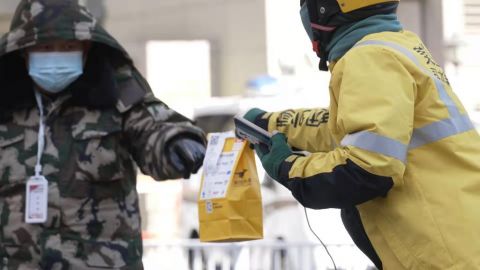 2月20日,内蒙古呼和浩特市的外卖骑手将餐食交给疫情防控工作者。新华社记者达日罕 摄