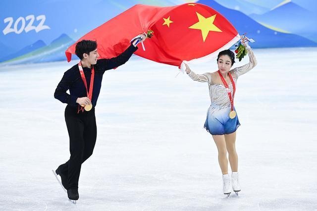 在花样滑冰双人滑项目中,中国组合隋文静/韩聪为中国代表团赢得了在本届冬奥会上的第9枚金牌。在2018年平昌冬奥会与金牌失之交臂后,隋文静/韩聪终于站上奥运会的最高领奖台,为彼此戴上金牌。