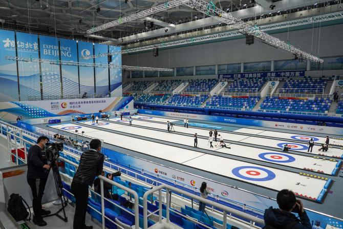 2021年4月6日,运动员在冰壶项目测试活动中。2022年北京冬奥会将国家游泳中心“水立方”改造为“冰立方”,用作冰壶项目比赛场馆。新华社记者彭子洋摄
