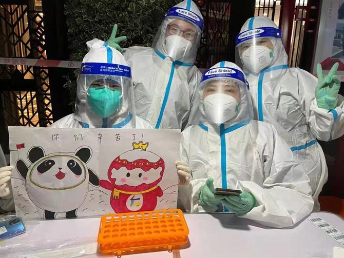 在苏州高新区第三轮区域核酸检测中,来自狮山商务创新区横山社区的几位少先队员为医护人员送上自己亲手制作的爱心卡片,上面写着“感谢白衣天使!”在新狮社区,小朋友把精心绘制的一副冬奥会吉祥物“冰墩墩”“雪容融”送给医护“大白们”,让大家在寒冷的夜晚感受到温暖。