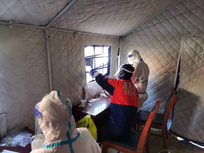 呼和浩特市消防救援支队“抗疫突击队”队员值守在临时核酸检测点。