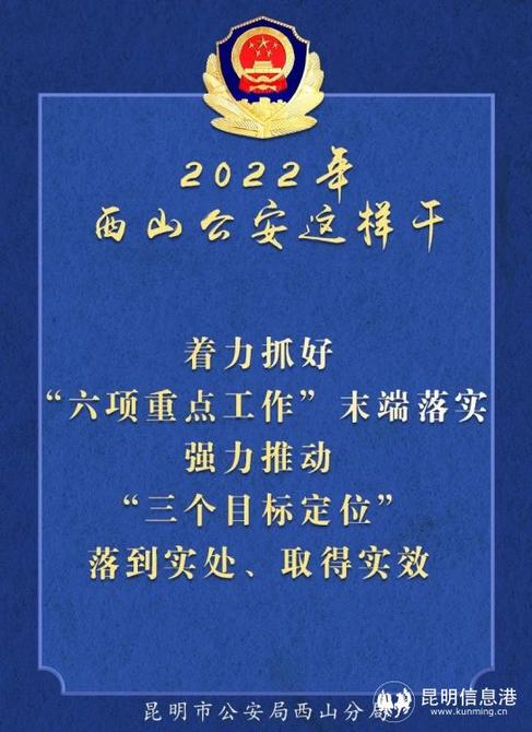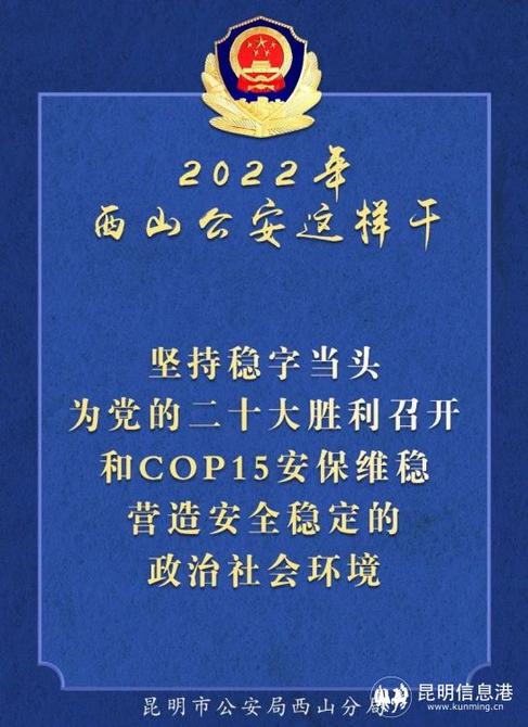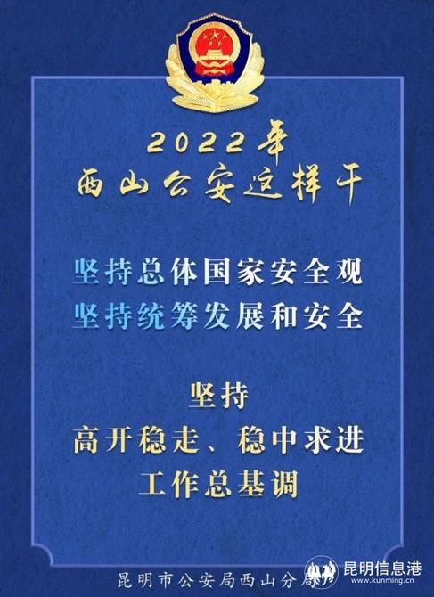 2022年,西山公安将坚持高开稳走、稳中求进工作总基调,立足新发展阶段、贯彻新发展理念、构建新发展格局,按照市公安局党委“11371”工作思路,牢牢把握“一季度开新局、二季度双过半、三季度功九成、四季度大收官”工作节奏,坚决打赢党的二十大和COP15安保维稳政治仗,为打造更具活力的区域性国际中心城市中枢门户区贡献西山公安智慧和力量。