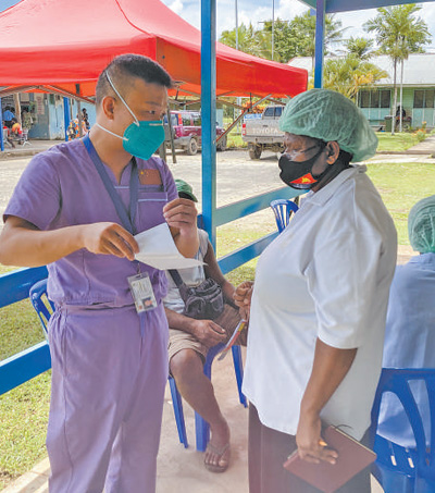 2021年8月25日,在巴布亚新几内亚新爱尔兰省卡维恩总医院,中国援巴新医疗队队员(左)向当地医护人员介绍疫苗接种注意事项。新华社发
