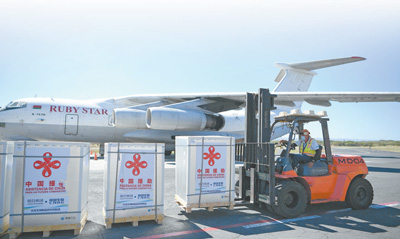 2021年12月24日,工作人员在尼加拉瓜马那瓜国际机场,转运由国药集团生产的新冠疫苗。 新华社发