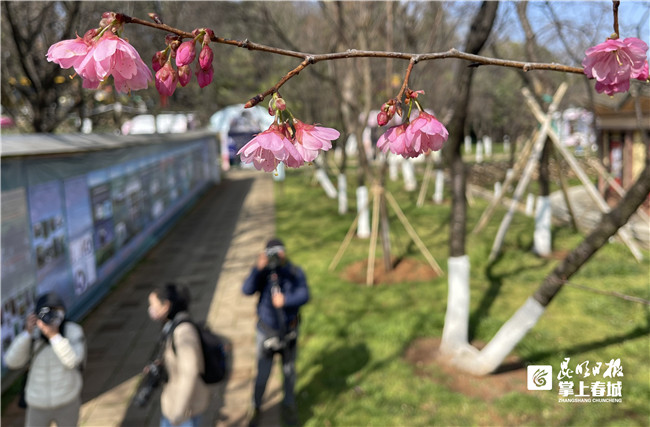 “圆通樱潮”位于昆明动物园核心景观区,南北宽约100米,东西长200多米。去年,昆明动物园对樱花树进行开沟复壮,美化树形并促使植株侧枝萌发。年初,又补种20株云南樱花。目前,园内2000多株云南樱花、垂丝海棠的花苞数量、开花丰满度较好,预计盛花期将迎来满树繁花、灿若红霞的盛景。为此,昆明动物园打造冬樱花游览南北环线、“北山冬韵”赏花区,首次推出樱花文创冰淇淋、樱花酸奶等樱花节限定美食,并上线“云”赏花系列活动。