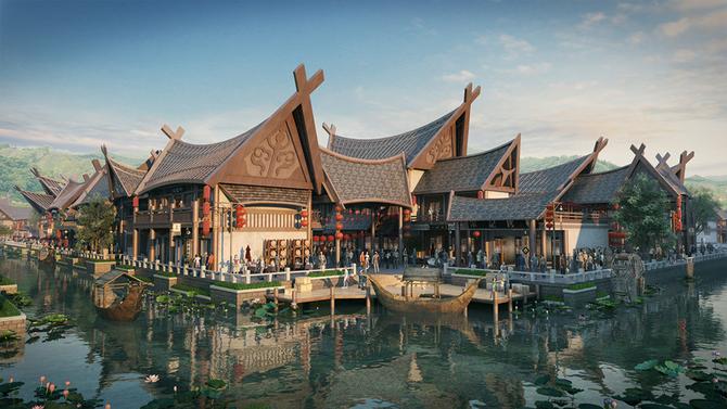 抚仙湖·广龙小镇整体建筑风格以传统滇中民居的空间布局和尺度为蓝本,结合滇中民居“一颗印”建筑形态特色,采用原生建筑材料和原始制作工艺,通过坡屋顶、门窗等构件以及门雕、隔扇等装饰符号来体现传统滇中民居特色,塑造兼具传统建筑风格和现代建筑风格特征的特色建筑,增强地方建筑文化特色。“仙湖迷城”作为整个小镇的文化精髓所在,与抚仙湖水下神秘的古城和失落文明产生关联,其建筑风格大量提取战国至东汉古滇国时期青铜文化“长脊短檐”的马鞍形建筑特点及元素,让散落的“俞元古城遗迹”成为重要景点,通过还原、重现整个滇濮民族部落千年传习、历代聚居的盛景,向游客提供滇中民俗文化、滇濮文化、非遗文化等极具特色的文化旅游体验。