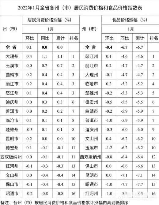 从食品价格看,16个州(市)环比4升2平10降,其中涨幅较大的是文山州,环比上涨0.4%,其次是丽江市和临沧市涨幅均为0.2%;从单月同比看,16个州(市)价格均下降。