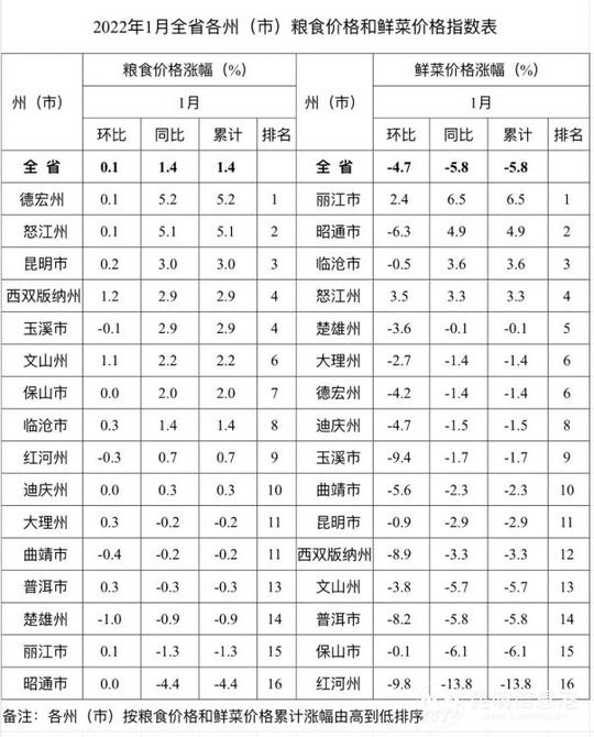 从鲜菜价格看,16个州(市)环比2升14降,其中涨幅较大的是怒江州,比上月上涨3.5%,其次是丽江市比上月上涨2.4%;从同比看,16州(市)价格4升12降,其中涨幅较大的是丽江市,比2021年1月上涨6.5%,其次分别是昭通市、临沧市、怒江州,涨幅分别是4.9%、3.6%、3.3%。