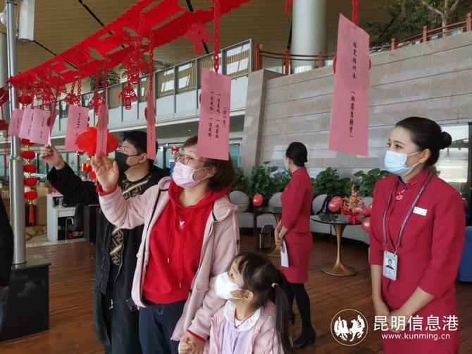 春运期间,长水机场东航值机柜台布置一新,悬挂中国结和灯笼,粘贴窗花进行装点,同时摆放鲜花和糖果。地面服务用语中增加节日祝福和问候语,在各服务区域为旅客赠送新年小礼物,同时还在东航V8贵宾休息室提供水果汤圆、豆面汤圆等特色餐食,以提高春运期间的旅客出行体验。除夕、初一和十五,乘务员们身着红色唐装在机门口热情地给每一位旅客拜年祝福,客舱壁板上张贴新年火红的“福”字和窗花,象征吉祥如意的中国结等,使旅客在旅途中也能感受到喜气洋洋的过年气氛。十五元宵佳节,东航云南公司在航班和贵宾休息室同旅客开展丰富多彩的互动活动,猜灯谜、有奖问答,旅客们踊跃参与,小朋友们更是在万米高空度过了一个不一样的元宵节。