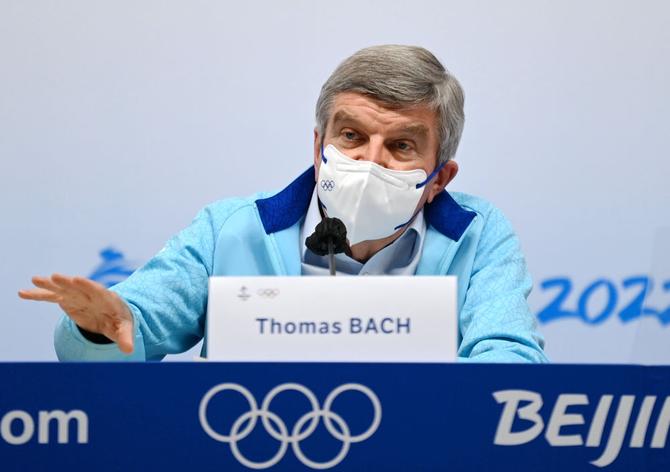 2月18日,国际奥委会主席巴赫在北京冬奥会主媒体中心出席新闻发布会。新华社记者李一博摄