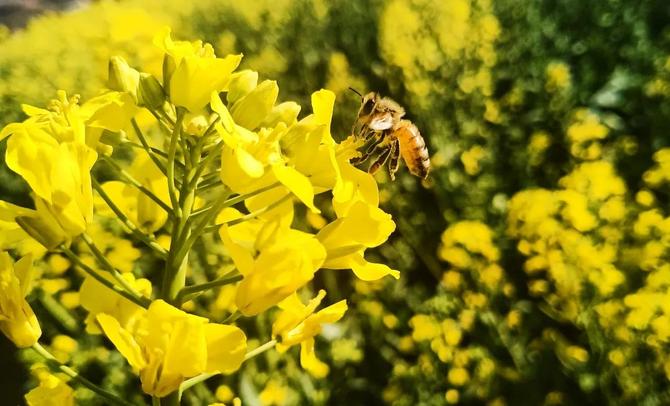 步入田畴,花的甜、花的香、花的纯粹,瞬间冲入你的嗅觉和视觉,让你眩晕沉醉;淡黄的花蕊间,蜜蜂彩翅轻摇,翩翩起舞,不急不躁,扇翅悬滞在半空中,紧紧盯着花蕊,菜花承重增加,左右摇摆,仿佛在尽力配合勤劳的蜜蜂,直至蜜蜂吮吸了花蜜,采到了花粉,真是“流连戏蝶时时舞,自在娇莺恰恰啼”。