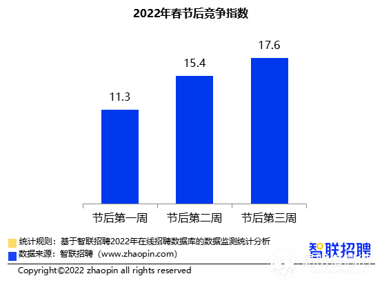 春节后第三周,人才市场求职活跃度再迎高峰,简历投递量环比增长10.5%,竞争指数由上周的15.4进一步升至17.6,这意味着一个空缺岗位平均收到约18份投递简历,呈现供需两旺的局面。