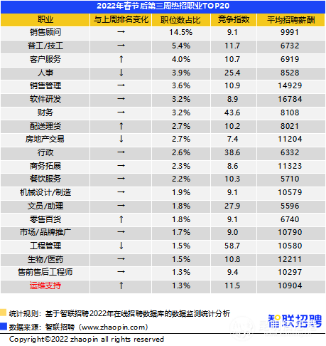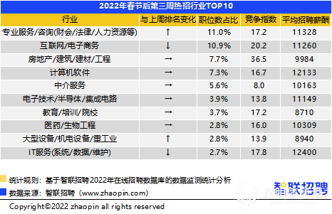 随着春节后企业经营活动及居民消费的展开,客服、运维、配送、零售等支持类人才需求规模扩张,招聘职位排名提升。同时,上述岗位的求职申请也有明显增加,运维支持、客户服务、配送理货、零售百货的简历投递量环比分别增长10.6%、17.4%、20.6%和27.4%,竞争指数均较第二周上升。本周餐饮业升温也较快,餐饮服务岗的招聘职位数环比增长6%,招聘规模占比扩大。