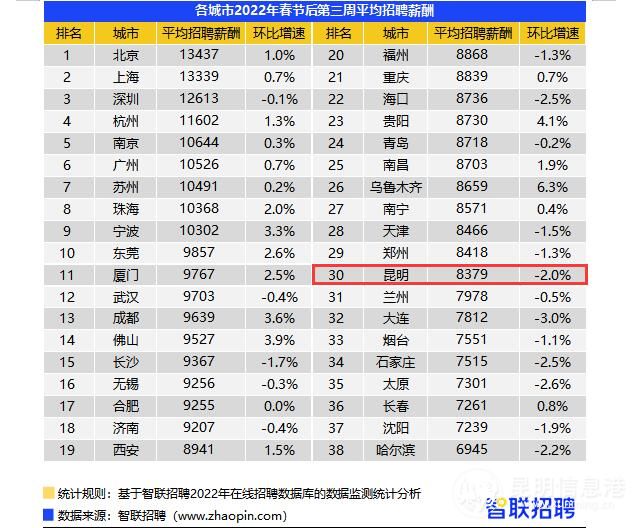 智联招聘近日发布《2022年春招市场行情周报(第三期)》,其中指出,节后第三周求职热度再迎高峰,竞争指数达17.6。装备制造岗位持续释放,IT互联网人才求职活跃,企业复工及居民消费带动客服、运维、配送等支持类人才需求上升。昆明的求职竞争指数在春节后前三周呈现逐渐升级趋势,而平均招聘薪酬呈现逐渐走低趋势,第三周为8379元/月,在全国38个核心城市中排在第30位。