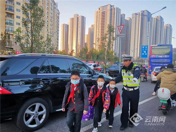 2月28日,马会坤在一二一大街护送孩子平安进学校。昆明市公安局交警支队供图