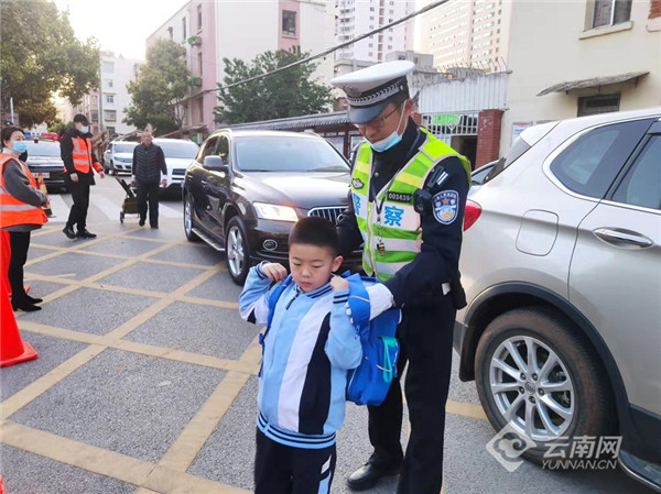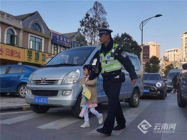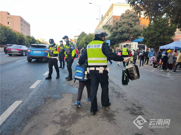 2月28日,昆明交警二大队民警在明通小学护学岗将孩子从家长车上接下并送进校园。昆明市公安局交警支队供图