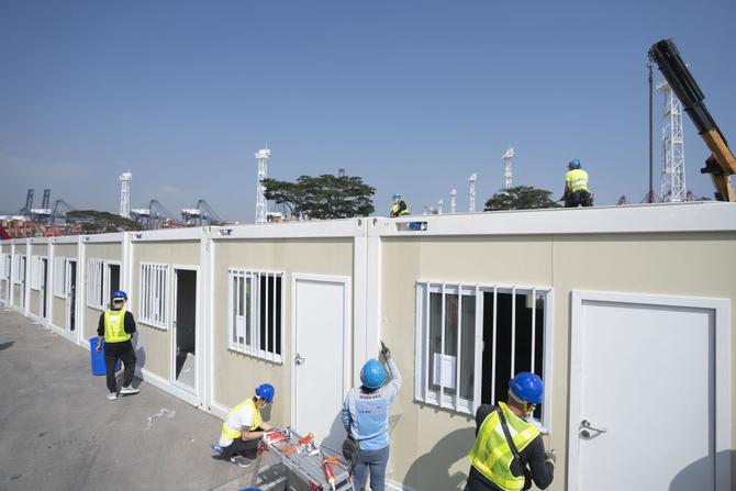 2月26日,工作人员在青衣方舱医院施工。 新华社记者 吕小炜 摄