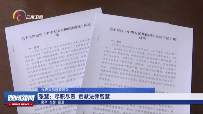 作为律师,张慧今年还将协助云南团撰写关于尽快出台《中华人民共和国能源法》以及关于修改《中华人民共和国企业破产法》两个议案。