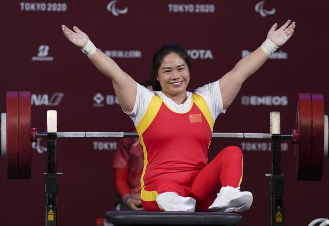 ⬆️2021年8月28日,中国选手谭玉娇在东京残奥会举重女子67公斤级决赛中夺冠后向观众致意。新华社记者 胡虎虎 摄
