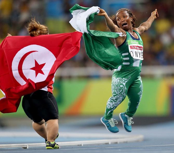 ⬆️2016年9月11日,在里约残奥会田径女子铅球F40级决赛中,尼日利亚选手昂耶获得金牌并创造新的世界纪录。昂耶(右)在夺冠后兴奋地跳跃庆祝。新华社记者李明摄