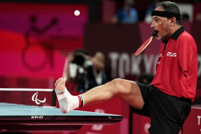 ⬆️2021年8月27日,埃及运动员易卜拉欣·哈马托在东京残奥会乒乓球小组赛中用脚抛发球。10岁时,哈马托由于一次火车事故使双臂致残。从那时起,他开始自学打乒乓球,并且训练出目前这套用脚抛发球、用嘴叼住球拍打球的独特方式。功夫不负有心人。他的不懈努力让他登上非洲残疾人乒乓球大赛、里约残奥会、东京残奥会的舞台。新华社记者 张铖 摄