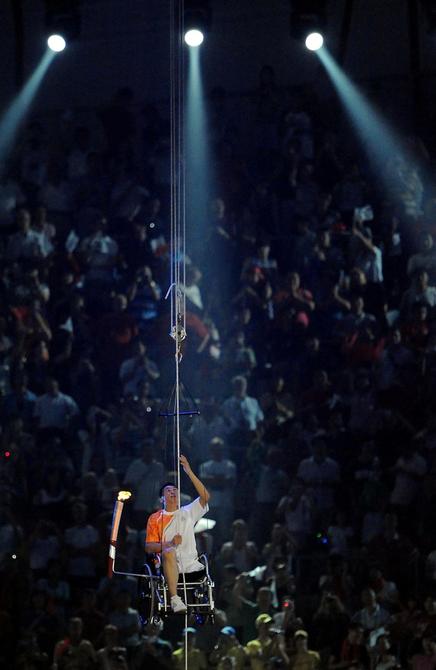 ⬆️2008年9月6日,北京残奥会开幕式在国家体育场举行,三届残奥会跳高冠军侯斌将火炬安置在轮椅的支架上,靠双手攀爬将近40米长的绳索,去点燃主火炬。这段艰辛的历程挑战着人类的体能极限,展现出人类坚韧不拔的精神。新华社记者王颂摄