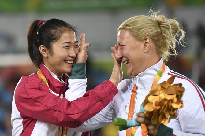 ⬆️2016年9月14日,在里约残奥会轮椅击剑女子个人花剑A级颁奖仪式上,金牌得主、中国选手荣静(左)与获得铜牌的匈牙利选手克拉伊尼亚克相互擦拭泪水。新华社记者夏一方摄