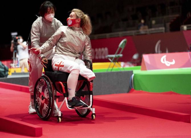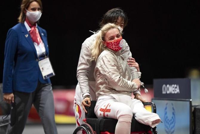 ⬆️2021年8月25日,在东京残奥会轮椅击剑女子佩剑个人赛A级决赛后,冠军中国选手边静(左)在获胜后推着亚军格鲁吉亚选手妮诺离开比赛场地。新华社记者 熊琦 摄