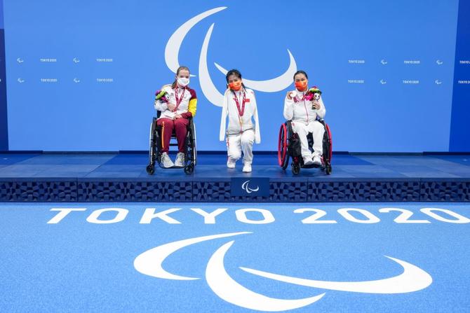 ⬆️2021年8月27日,在东京残奥会游泳女子50米蝶泳S5级颁奖仪式上,中国选手卢冬(中)单腿下蹲,与队友成姣(右)、西班牙选手玛尔塔·因方特处于同一高度合影。新华社记者 张铖 摄