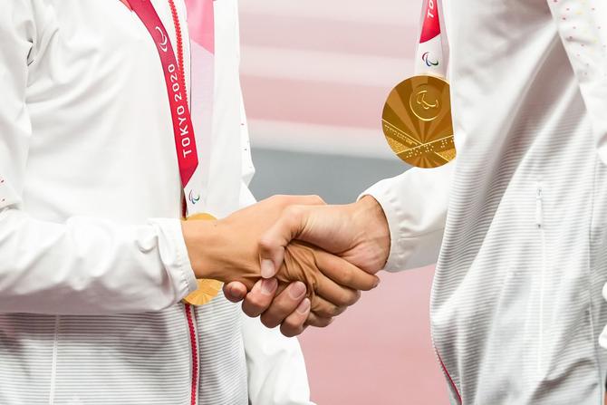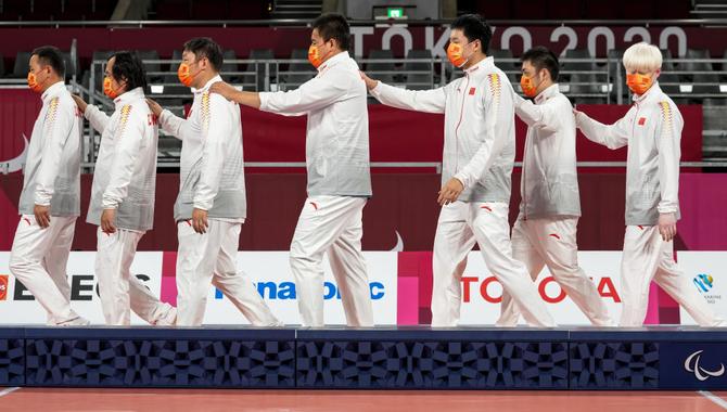 ⬆️2021年9月3日,在日本千叶举行的东京残奥会男子盲人门球颁奖仪式中,中国队教练尹世强(左一)带领球员,相互扶着肩膀,参加颁奖仪式。 新华社记者 张铖 摄