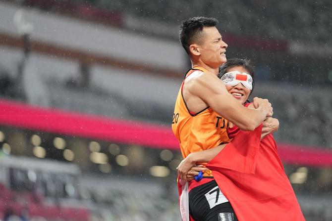 ⬆️2021年9月4日,在东京残奥会田径女子200米T11级决赛中,中国选手刘翠青获得金牌。她的领跑员徐冬林将她高高举起,一同庆祝。新华社记者 熊琦 摄