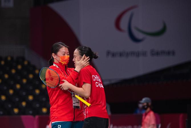 ⬆️2021年9月5日,在东京残奥会羽毛球女子单打SL4级决赛中后,中国选手程和芳(右)与教练张先明庆祝夺冠。新华社记者 张金加 摄