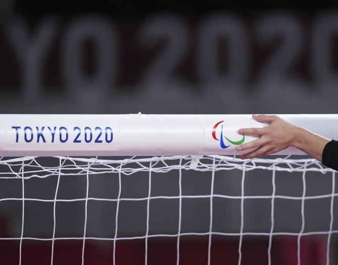 ⬆️2021年8月26日,在日本千叶举行的东京残奥会男子盲人门球小组赛中,中国队球员杨明源在赛前感知球门。新华社记者 胡虎虎 摄