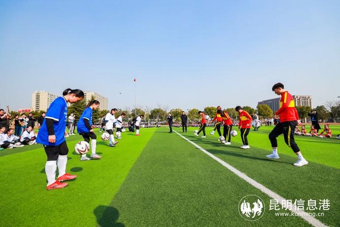 景成实验学校女足校队的小队员们与中国女足PK颠球