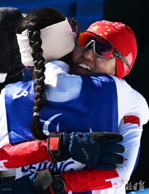 2022年3月5日,中国选手郭雨洁和赵志清(右)在赛后拥抱庆祝。当日,北京2022年冬残奥会残奥冬季两项女子短距离站姿比赛在国家冬季两项中心举行。中国选手郭雨洁夺得金牌,中国选手赵志清获得铜牌。河北日报记者 贾恒 摄