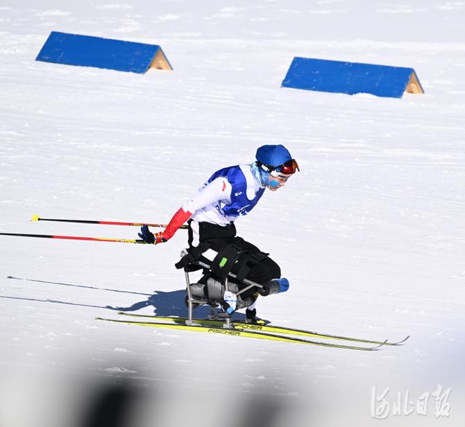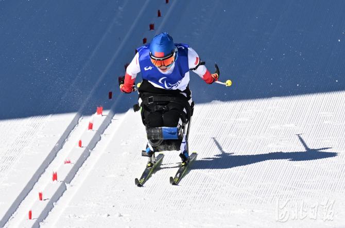 2022年3月5日,中国选手单怡霖在比赛中。当日,北京2022年冬残奥会残奥冬季两项女子短距离(坐姿)比赛在国家冬季两项中心举行。中国选手单怡霖获得亚军。河北日报记者 贾恒 摄