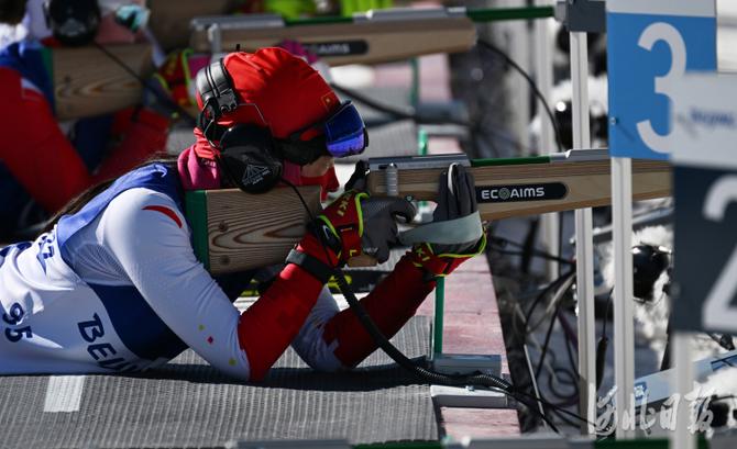 2022年3月5日,中国选手王跃在比赛中射击。当日,北京2022年冬残奥会残奥冬季两项女子短距离(视障)比赛在国家冬季两项中心举行。中国选手王跃获得第4名。河北日报记者 贾恒 摄