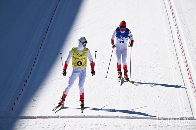 2022年3月5日,中国选手党鹤松(左)和引导员秦海洋在比赛中。当日,北京2022年冬残奥会残奥冬季两项男子短距离(视障)比赛在国家冬季两项中心举行。中国选手党鹤松获得第8名。河北日报记者 贾恒 摄