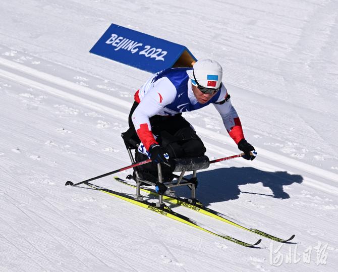 2022年3月5日,中国选手刘梦涛在比赛中。当日,北京2022年冬残奥会残奥冬季两项男子短距离(坐姿)比赛在国家冬季两项中心举行。中国选手刘梦涛获得铜牌。 河北日报记者 贾恒 摄