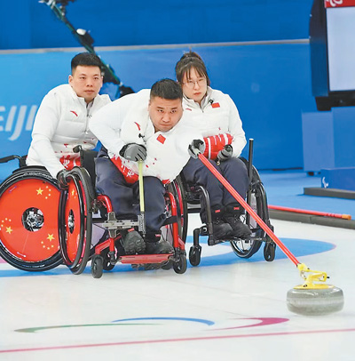 3月6日,中国代表团运动员王海涛(中)在轮椅冰壶循环赛对阵爱沙尼亚队的比赛中。