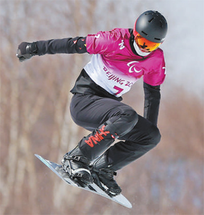 3月6日,中国代表团运动员纪立家在残奥单板滑雪男子障碍追逐资格赛中。