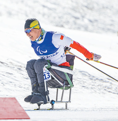 3月6日,中国代表团运动员毛忠武在残奥越野滑雪男子长距离坐姿组比赛中。