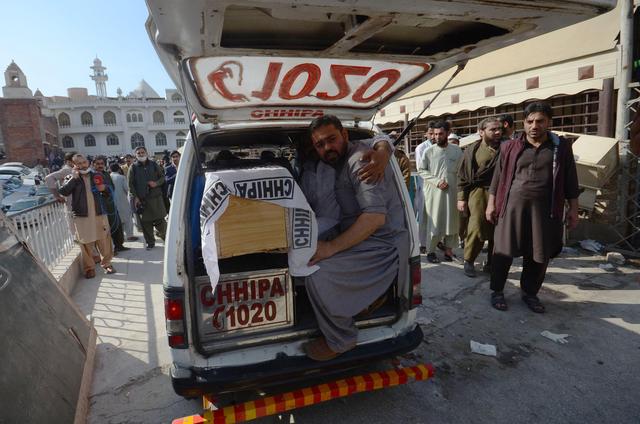 3月4日,在巴基斯坦白沙瓦,一名男子坐在载有棺材的救护车上。新华社发