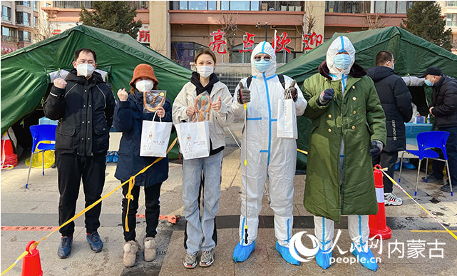 “第一轮大规模核酸检测开始的时候,我傍晚在小区院里排队,那天天气比较冷,我看到工作人员挺辛苦的。因为我有一家面包店就开在小区门口,当时就拿了一些面包给工作人员送过去。”呼和浩特市民杨艺欣在做核酸检测时萌生了一个善意的想法——力所能及为战“疫”工作人员送去温暖。