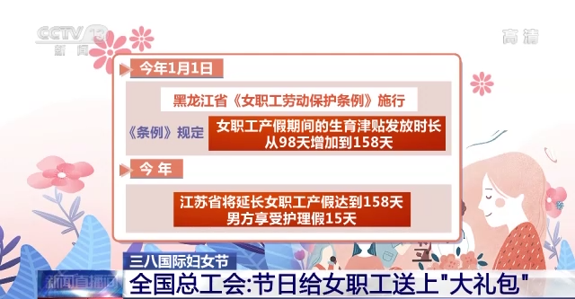 今年1月1日,黑龙江省《女职工劳动保护条例》施行,《条例》规定女职工产假期间的生育津贴发放时长从98天增加到158天。据了解,今年,江苏省将延长女职工产假达到158天,男方享受护理假15天。