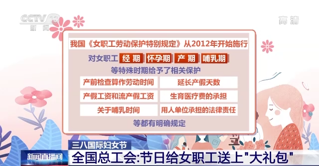 8日是国际妇女节,我国有女职工1.37亿人,中华全国总工会积极推进《妇女权益保障法》《女职工劳动保护特别规定》等法律法规的贯彻落实,维护了女职工的合法权益和特殊利益。