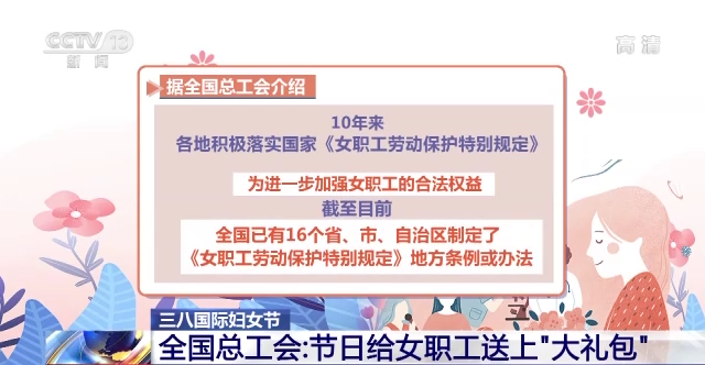 据全国总工会介绍,10年来,各地积极落实国家《女职工劳动保护特别规定》。为进一步加强女职工的合法权益,截至目前,全国已有16个省、市、自治区制定了《女职工劳动保护特别规定》地方条例或办法。