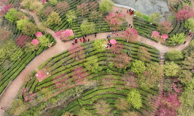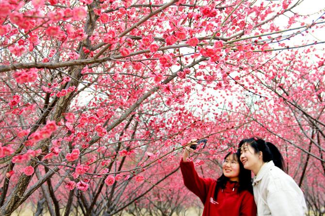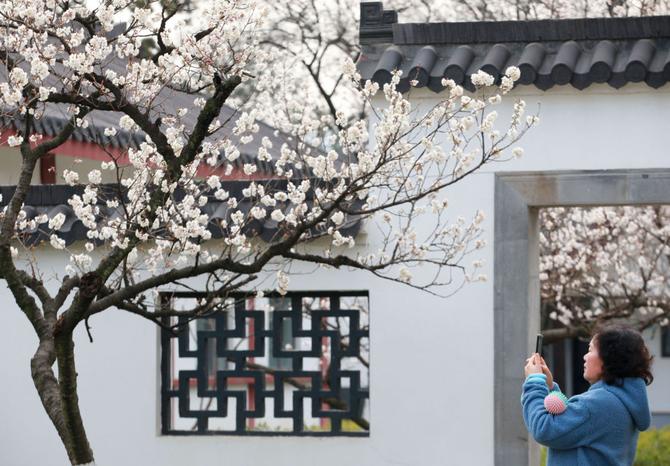 ↑3月6日,在安徽省淮北市南湖风景区,人们在梅花园赏花游玩。
